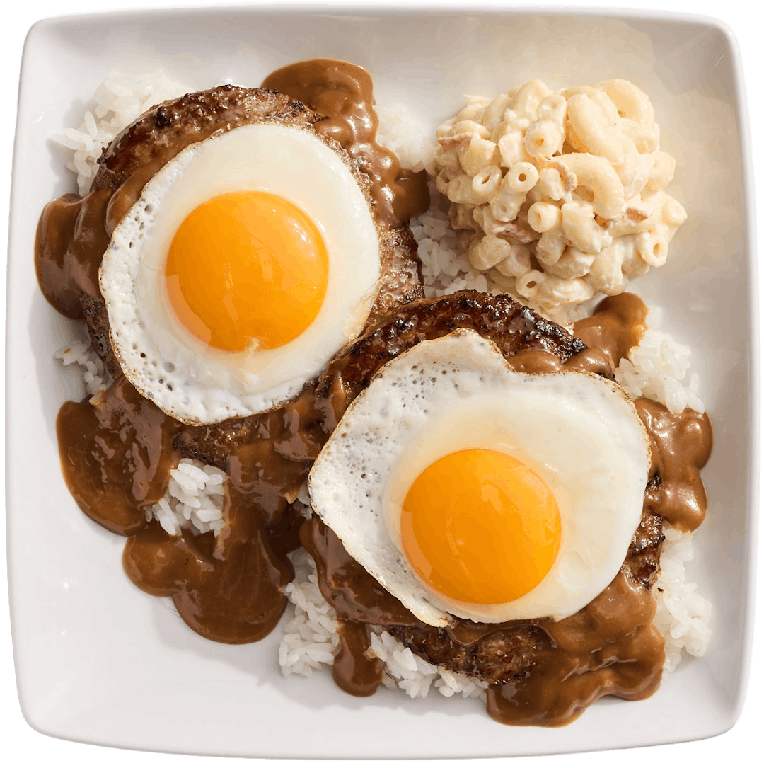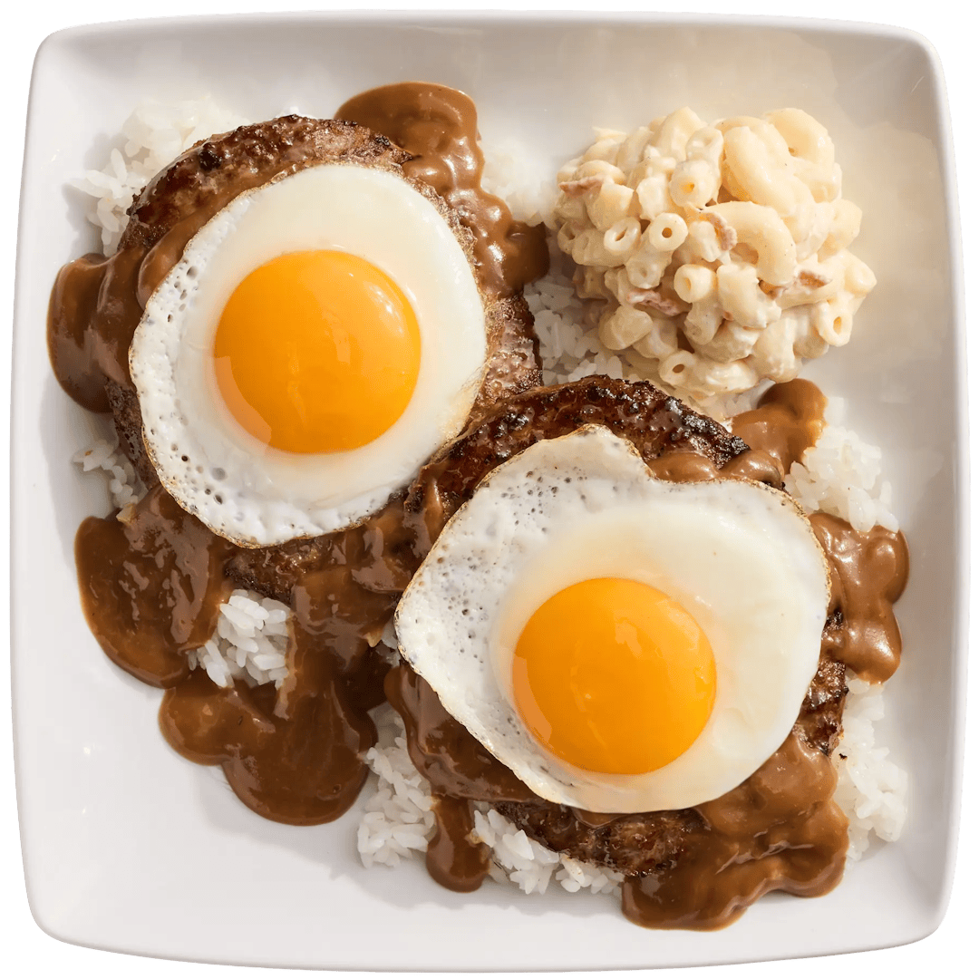 Savory hamburger patties over rice, topped with brown gravy and 2 fresh fried eggs.